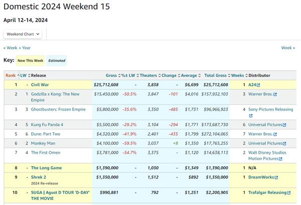 北好意思最新周末(4.12-4.14)票房出炉!亚历克斯·加兰(《消失》《机械姬》)导演新片《内战》北好意思首周末三天在3838馆,收货2571万好意思元票房,大大超出预期,创造A24影史最好北好意思开画成绩。这一成绩简直两倍于此前记载保合手者——2018年《遗传恶运》的1360万买球下单平台,也优于《拿破仑》(2060万好意思元)、《花月杀手》(2330万好意思元)等大型营业片的开画。