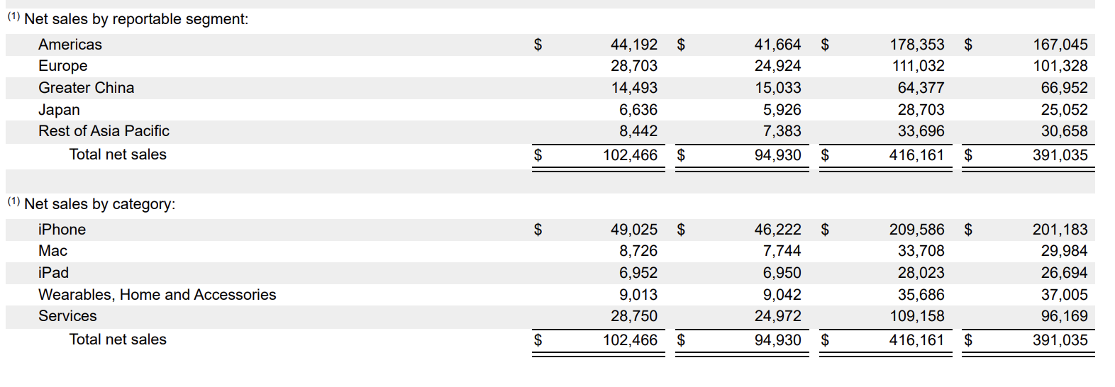 第四财季中,苹果营收达到1024.66亿好意思元,进步千亿好意思元,创下同期历史新高,同比增长8%;净利润274.66亿好意思元,同比大增86%;每股摊薄收益1.85好意思元,同比高潮91%。