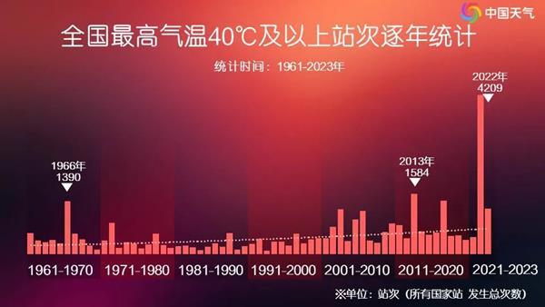 40℃以上的高温闷热天气确实越来越多了吗?从数据来看,是的。中国天气网通过清点1961年至2023年风物大数据发现,这63年中,寰球国度级风物不雅测站出现40℃及以上的高温总体照实呈现增长趋势,其中2022年最多,高达4209站次。