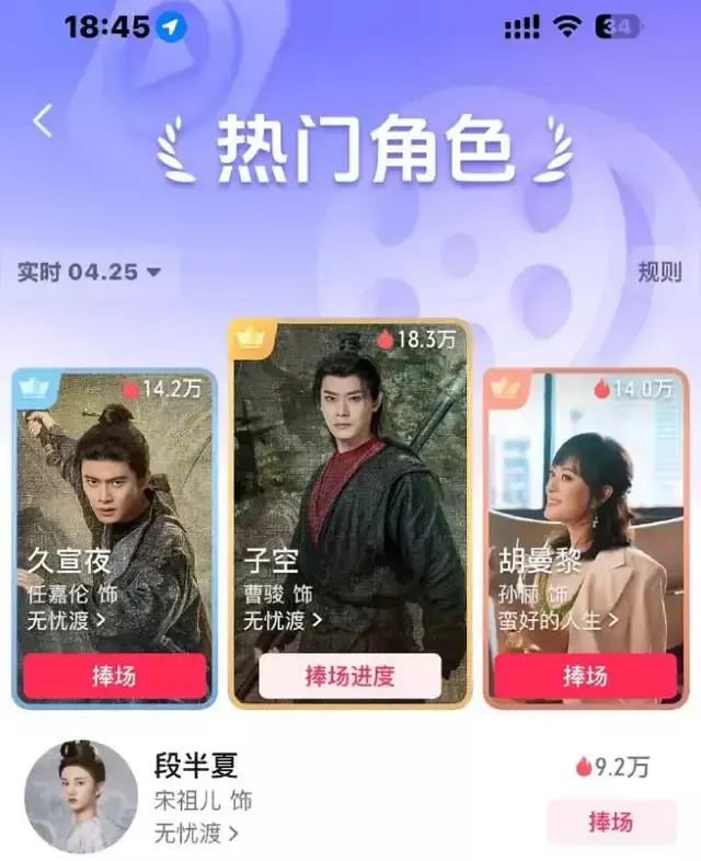 《无忧渡》播出的技艺,在热点脚色榜单中,曹骏饰演的“子空”得胜登顶,排在第二名的是任嘉伦饰演的“久宣夜”,也便是说,曹骏吃到脚色带来的红利。