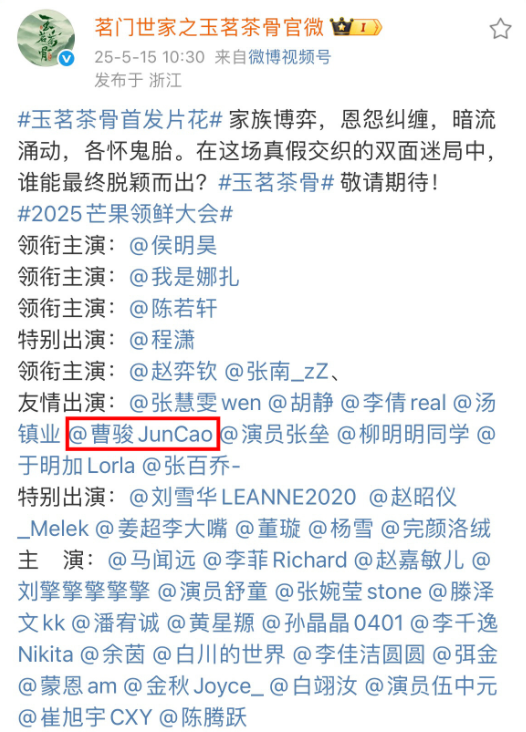 当曹骏的热度和关爱度抵制高潮后,网友们但愿他可以凭借剧的热度多接一些脚色,让内行感到惊喜的是,曹骏竟竟然接到新脚色,他将友情出演《玉茗茶骨》。