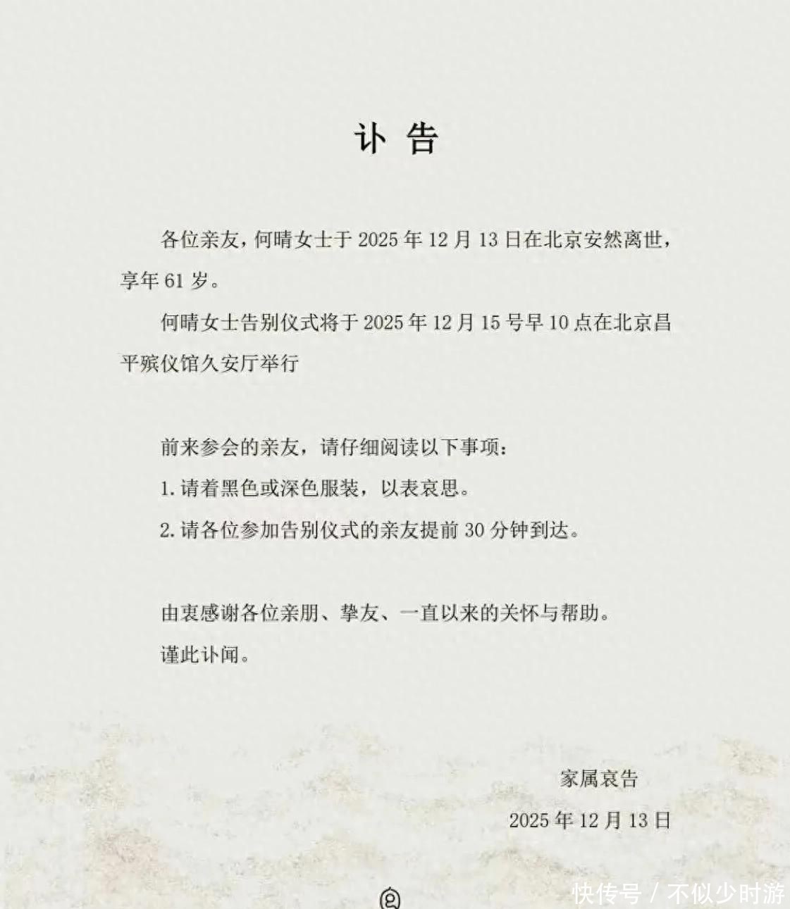 左证家属公布的安排,何晴的告别典礼定于2025年12月15日上昼10点举行。